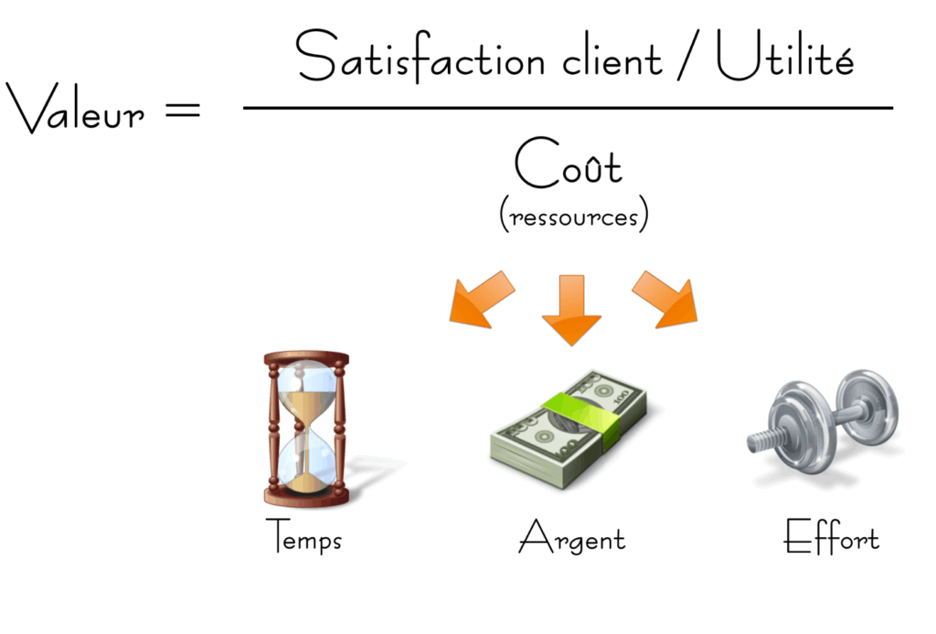 La valeur est liée à la satisfaction client / à l’utilité de notre service, produit, processus. Elle dépend également du coût, des ressources en termes de temps, d’argent, d’efforts et ce tout au long du cycle de vie du produit/ projet (analyse, acquisition/achat, réalisation/production, maintenance…).